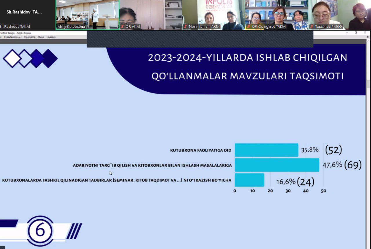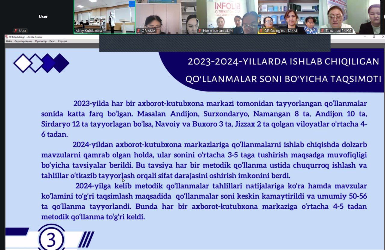 2025-yil 13-noyabr kuni O‘zbekiston Milliy kutubxonasida “INFOLIB O‘ZBEKISTON-2025” XIV Milliy axborot-kutubxona haftaligi doirasida Hududiy axborot-kutubxona markazlari tomonidan 2023-2024 yillarda ishlab chiqilgan metodik qo’llanmalar tahlili – “Metodik qo‘llanmalarni tuzish texnologiyasi” mavzusida seminarda Do`stlik tuman axborot-kutubxona mutaxassisi ishtirok etdi.