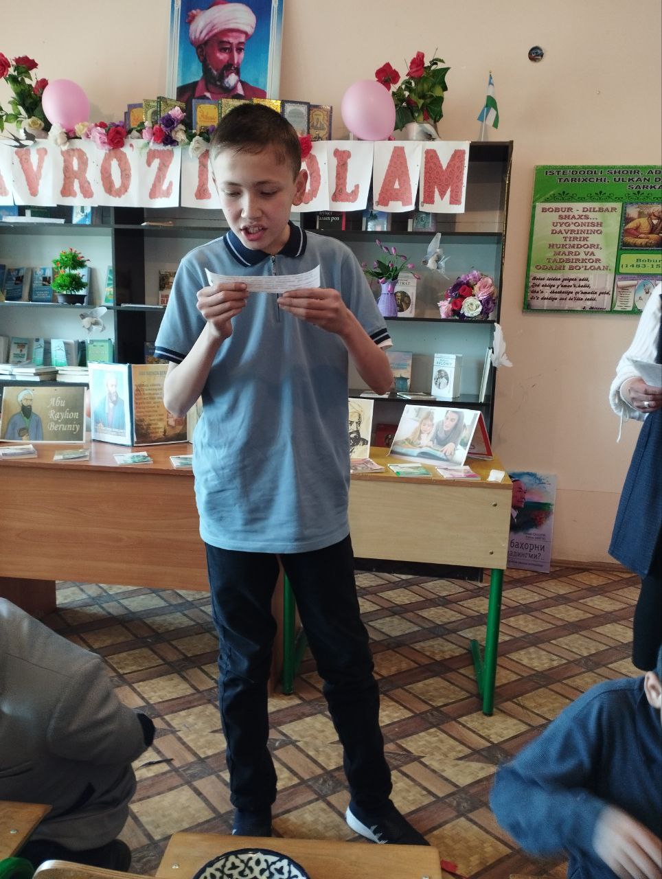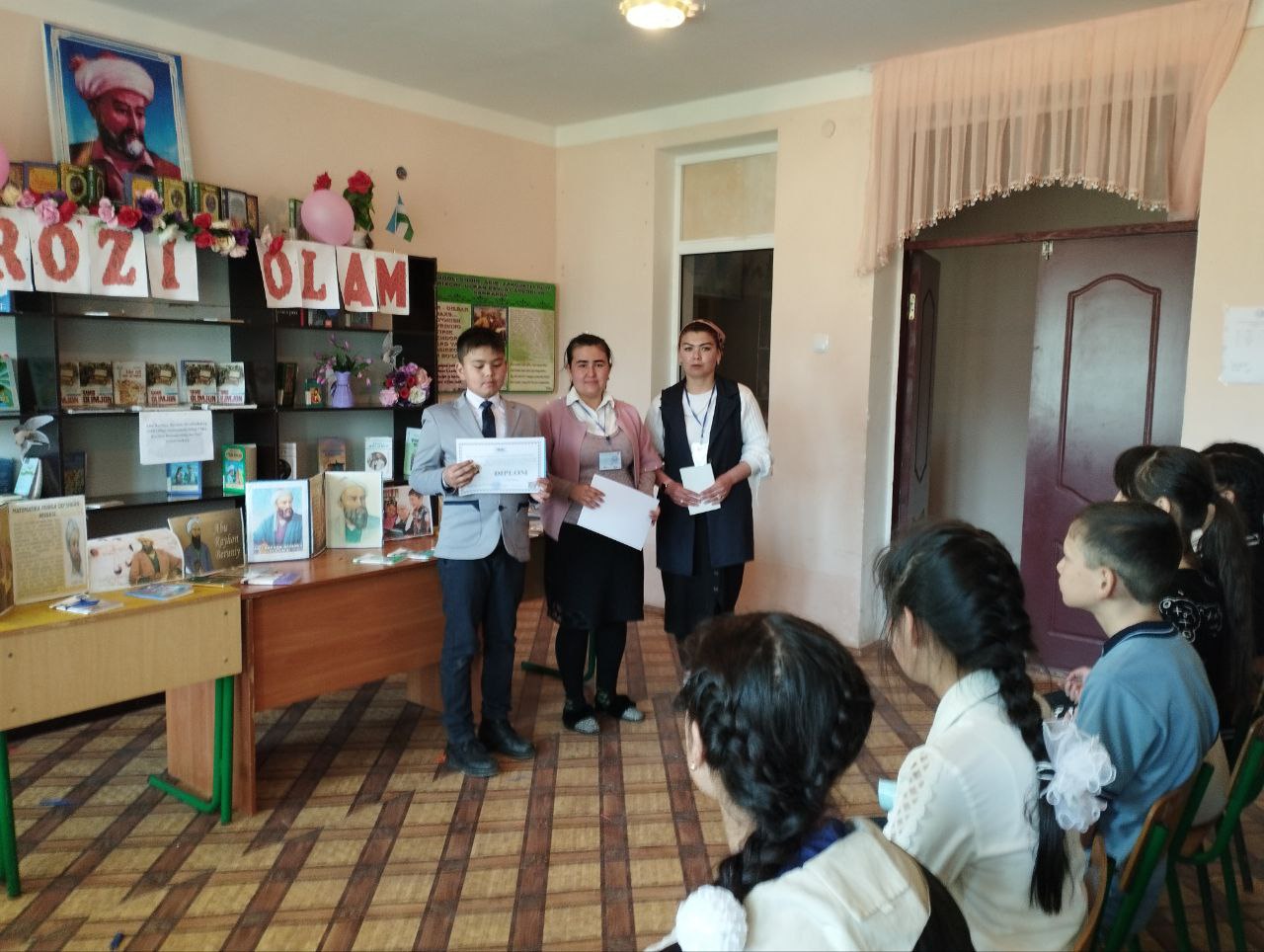 Abu Rayhon Beruniy tavalludining 1050 yilligi munosabati bilan "Abu Rayhon Beruniyning merosi" nomli tadbir oʻtkazildi.Faol kitobxon o`quvchilar ishtirokida o`tkazilgan tadbirda dastlab Beruniy hayoti va ijodi haqida ma`lumotlar berilib, so`ng tadbir qiziqarli savol-javoblar, Allomamizning gʻazal va hikmatli satrlaridan ifodali oʻqish kabi shartlar asosida davom etdi. Tadbir so`nggida faol qatnashgan ishtirokchilar diplom va esdalik sovgʻalari bilan taqdirlandi.