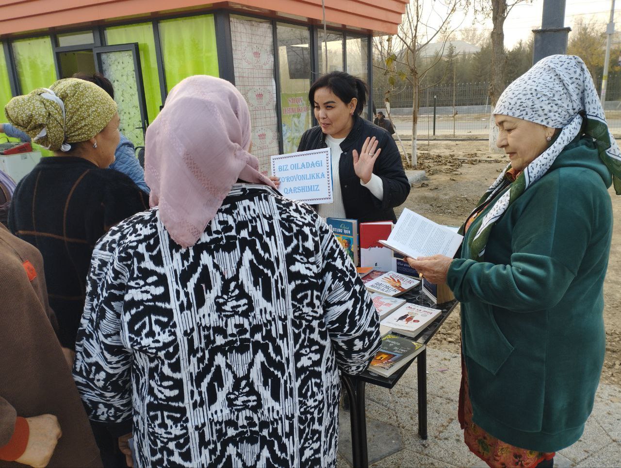 Joriy yilning 25-noyabr sanasida Do'stlik tuman axborot - kutubxona markazi xodimlari tomonidan "Kitobsevar millat" shiori ostida Do'stlik tumani Mevazor MFY hududidagi sohil bo'yida "Biz oiladagi zo'ravonlikga qarshimiz" nomli davra suhbati tashkil qilindi. Ushbu davra suhbatida kitobxonlarga oilaviy munosabatlarda huquqiy madaniyatini oshirish, zo'ravonlikning oldini olish, sog'lom va totuv oilaviy muhitni shakllantirish borasida ma'lumotlar berildi va ushbu mavzuda yozilgan kitoblar oʻqish uchun tavsiya etildi. Shuningdek tadbir davomida ishtirokchilarga oiladagi psixalogik, jismoniy va iqtisodiy zo'ravonlik tushunchalari, ularning oqibatlari hamda bunday holatlar yuzaga kelmasligi uchun amalga oshirish kerak bo'lgan choralar haqida batafsil ma'lumot berildi va ishtirokchilar ham o'z fikr- mulohazalarini bildirib, mavjud muamolar bo'yicha savollariga javob oldilar.