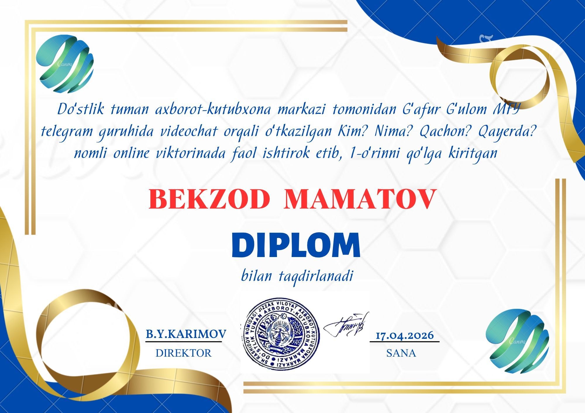 Do'stlik tuman axborot-kutubxona markazi va Yoshlar ishlari agentligi hamkorlikda G'.G'ulom mahallasining telegram guruhida "Kim? Nima? Qachon? Qayerda?" nomli intellektual online viktorina o'tkazildi. Viktorinaga barcha yoshlarva fuqarolar qiziqish bilan ishtirok etib, oʻz bilimlarini sinovdan oʻtkazishdi va yakunda eng koʻp savollarni topgan Bekzod Mamatov 1-oʻrinni qoʻlga kiritdi va Diplom bilan taqdirlandi.