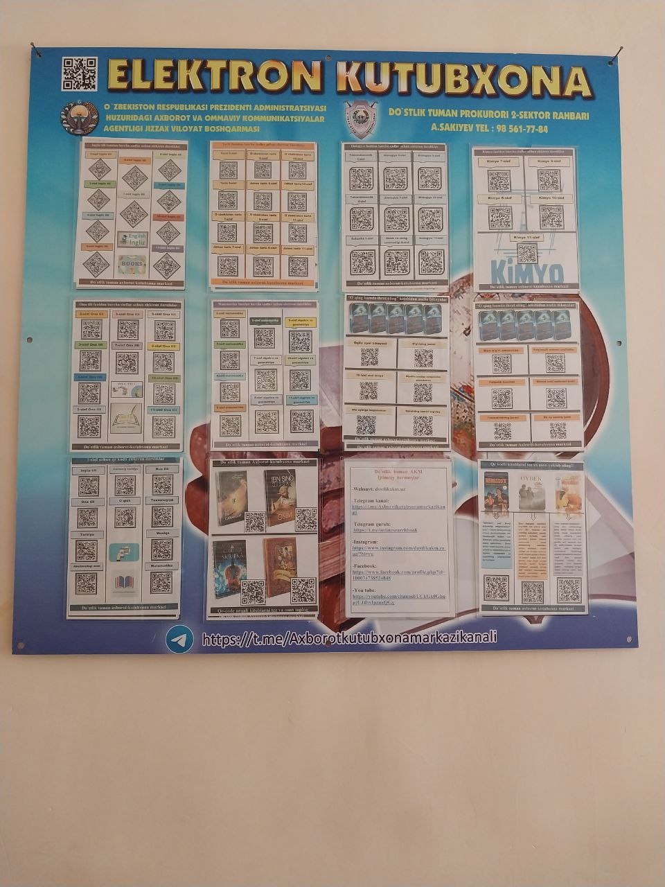 Do`stlik tuman axborot-kutubxona markazi xodimlari tomonidan Yo`l-yo`lakay o`qiymiz loyihasi asosida Chinobod MFY da joylashgan 2-IDUM da tashkil qilingan "Elektron kutubxona" burchagidagi qr kodli kitoblar yangi adabiyotlar bilan almashtirilib, targ`ibot ishlari amalga oshirildi. Shuningdek yangi yaratilgan qr kodli kitoblardan foydalanish qoidalari haqida ham o`quvchilarga tushunchalar berildi.