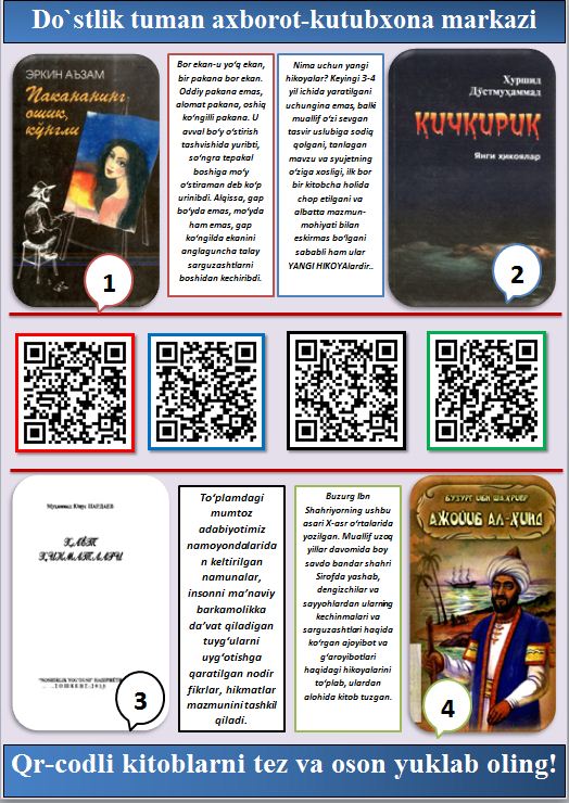 Do`stlik tuman axborot-kutubxona markazi tomonidan navbatdagi qr kodli kitoblar yaratildi. Kirib yuklab olishingiz mumkin.