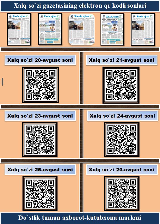 Do`stlik tuman axborot-kutubxona markazi tomonidan tayyorlangan Qr-kodli "Xalq so`zi" gazetasining 20-26 -avgust sonlari mutolaa uchun yuklab olib o`qishingiz mumkin.