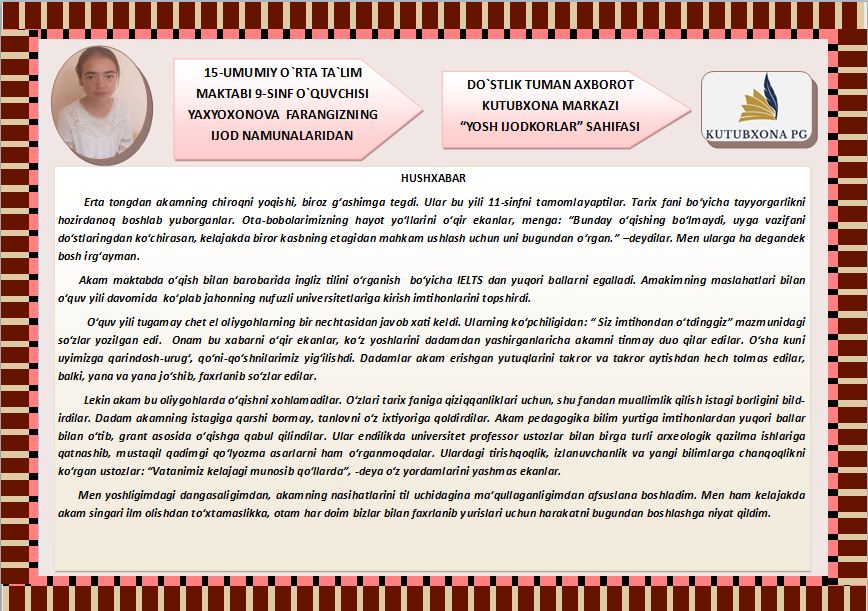 15-UMUMIY O`RTA TA`LIM MAKTABI 9-SINF O`QUVCHISI YAXYOXONOVA FARANGIZNING IJOD NAMUNALARIDAN